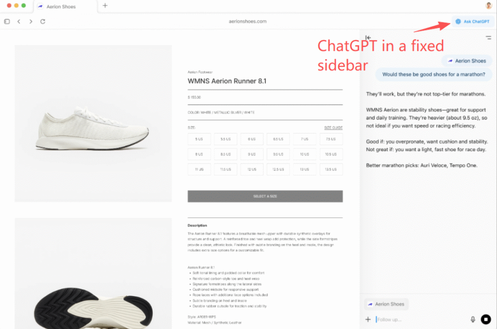 ویژگی: نمایش ChatGPT در نوار کناری ثابت (sidebar) برای گفتوگوی لحظهای، خلاصهسازی، بازنویسی، و پرسش دربارهی محتوای صفحهی جاری.